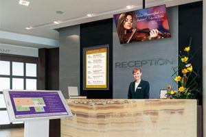 Hotels are beginning to use interactive reception screens to display dynamic content to guests as well as internal staff. From advertising local restaurants and theatre showings, through to excursions and car rental packages, these screens allow guests to quickly see what is going on, without needing to visit the concierge desk.