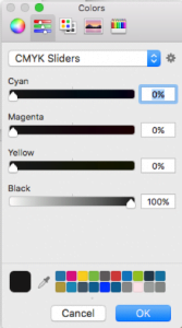 Step 2 – Click on the second tab along with the colour sliders. On the dropdown just below the tabs, use the dropdown to select ‘CMYK Sliders’. Make sure Cyan, Magenta and yellow are all set to 0% and black is set to 100%. This will ensure you are only using single colour black for the text.